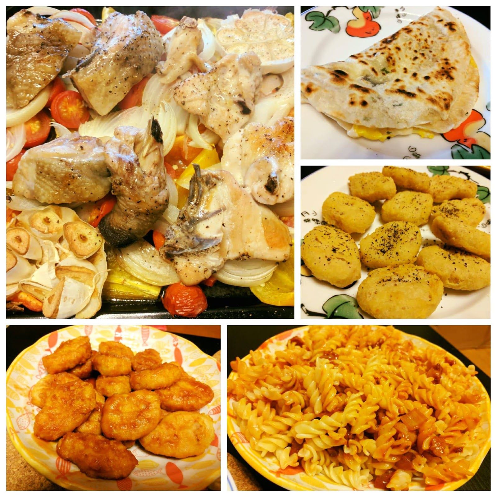 糖醋雞塊(51/100)+胡椒炸雞塊(52/100)+香腸蕃茄義大利麵(53/100)+蔥油餅加蛋(54/100)+蒜香時蔬烤雞(55/100)