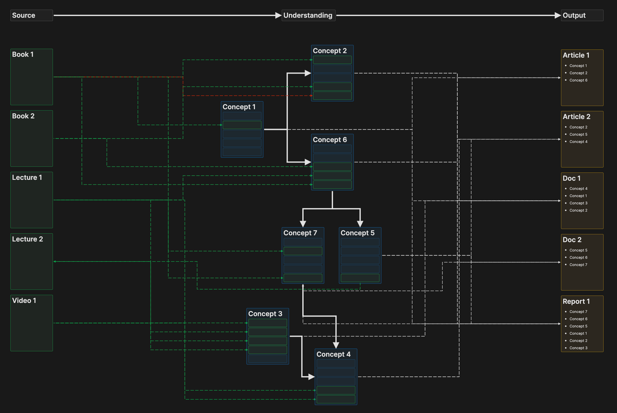 In the future, whether I'm writing academic papers, work plans, or online articles, my process will involve linearly reassembling these concept cards into an "output card," which is an article meant for others to read. As I absorb and break down more and more "sources" during research, my "understanding" in the middle will deepen continuously, and the "output" on the right will naturally be of higher quality.