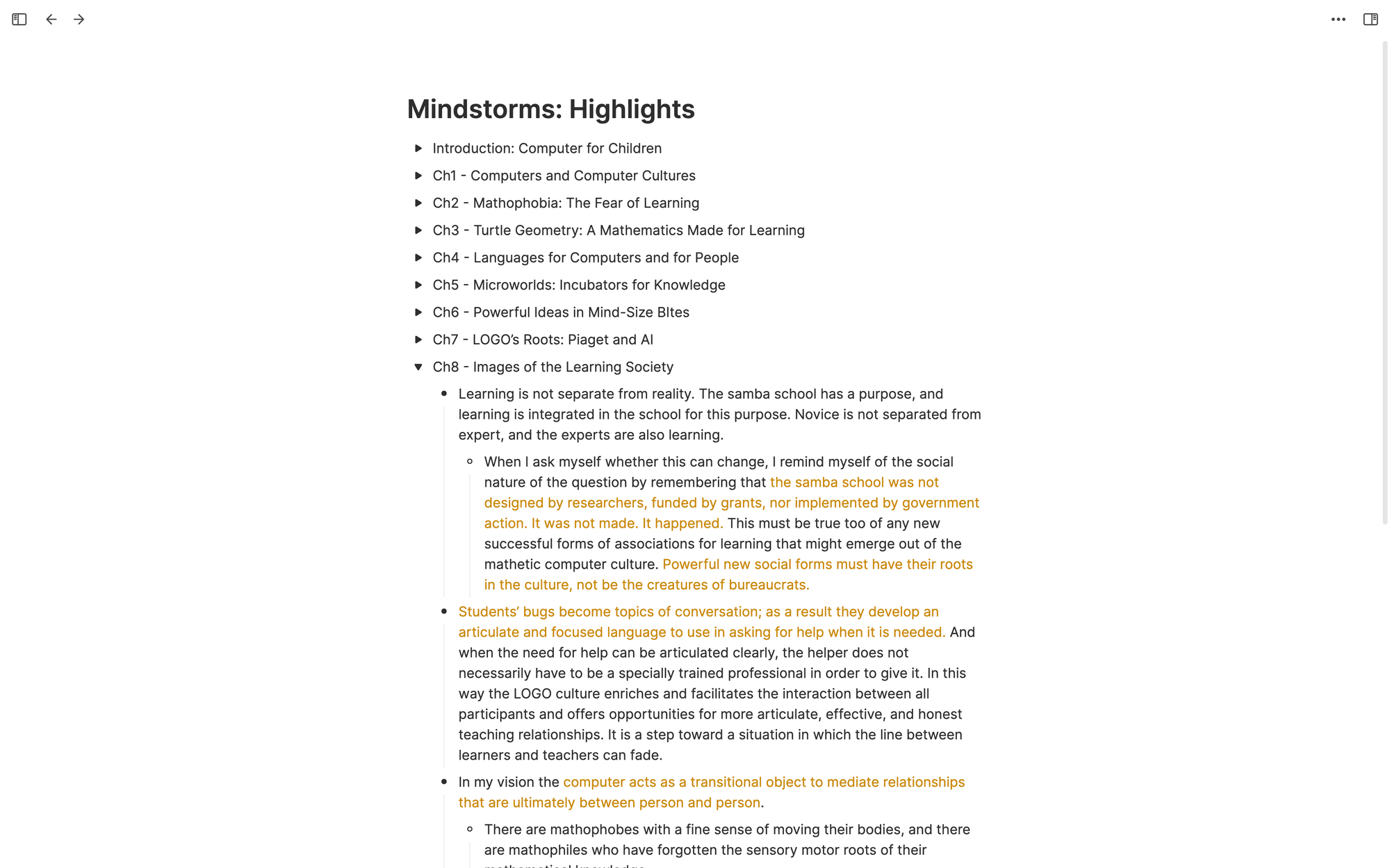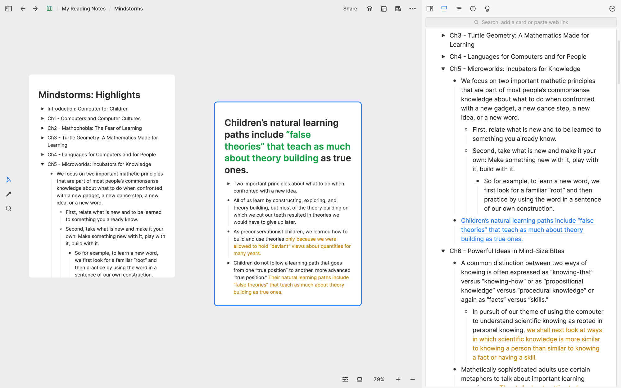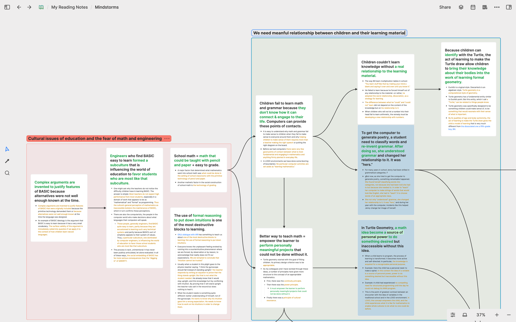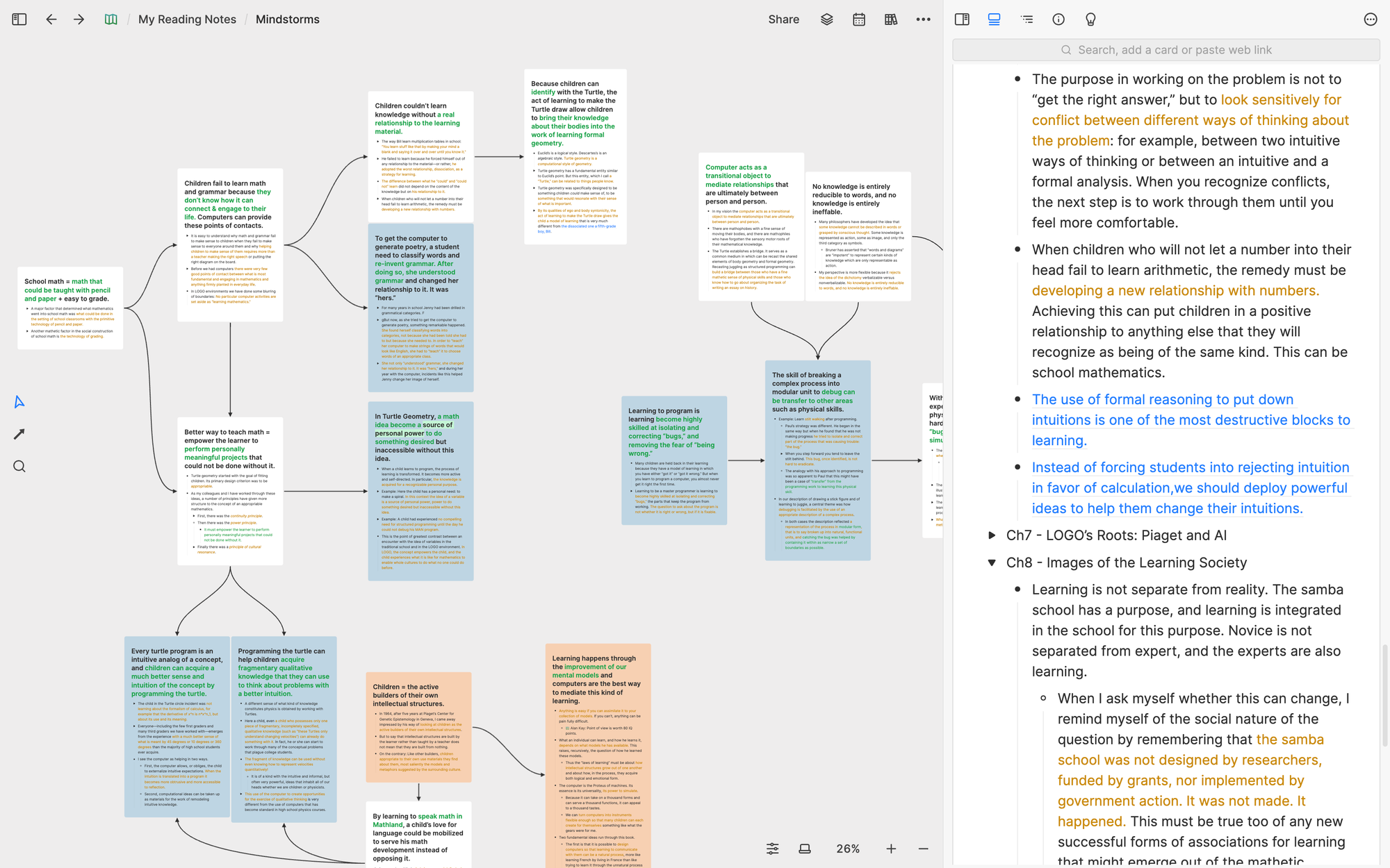 Here's a video of how I conduct this process. This video is not staged. It's a real example of how I develop an understanding of a book I read called Mindstorms: Children, Computers, and Powerful Ideas. You don't need to watch it fully (it's 4 hours long!), but quickly skimming through different parts of the video will give you a clear sense of how I extract core concepts from the book and develop my understanding of it. If you want to explore and play with the whiteboard I created in the video, here’s the link to it.