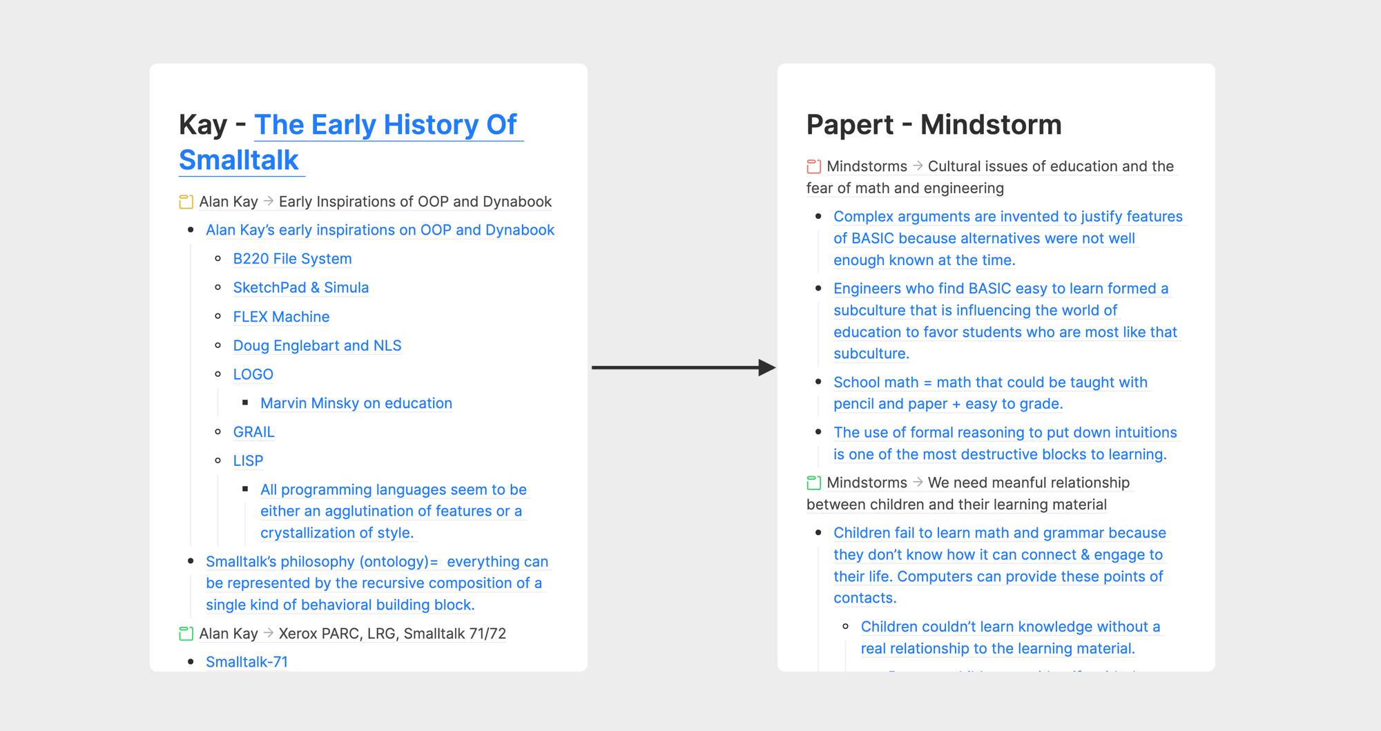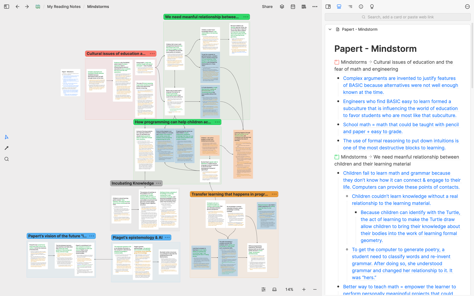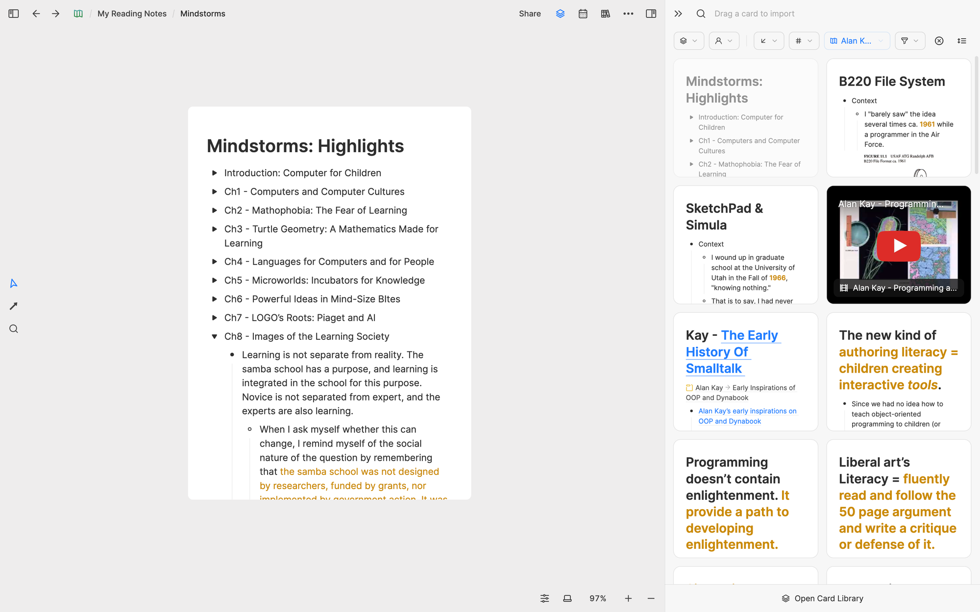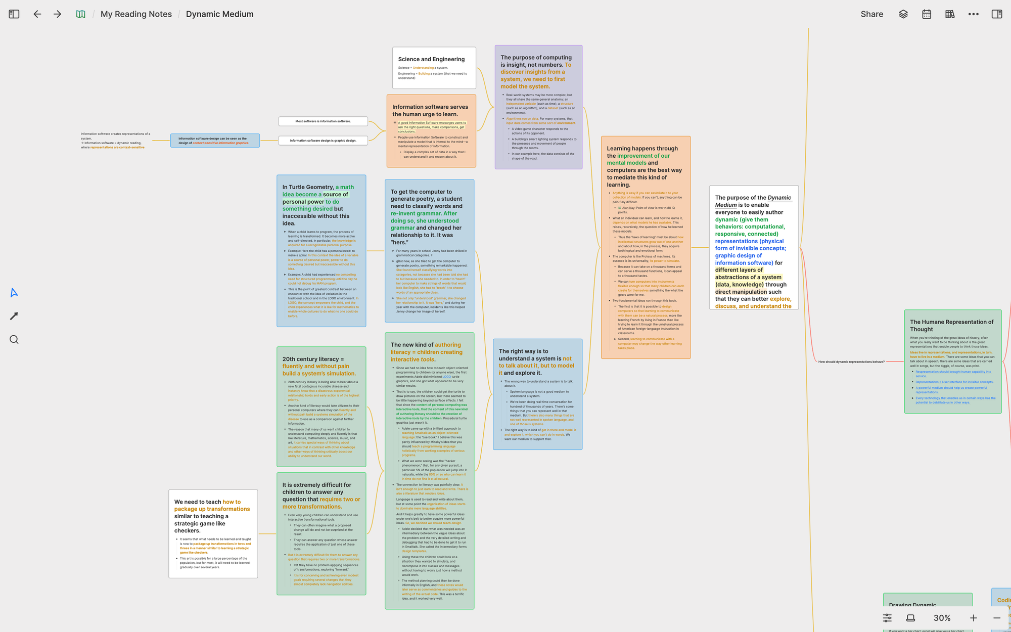 For instance, I've recently been researching how to design a computer-driven dynamic medium, and both books Mindstorms and The Early History of Smalltalk are highly relevant to this research topic. To better conduct this research, I created a whiteboard called Dynamic Medium and reused concept cards related to Dynamic Medium from these two books, organizing them using a mindmap to establish a unique understanding framework.