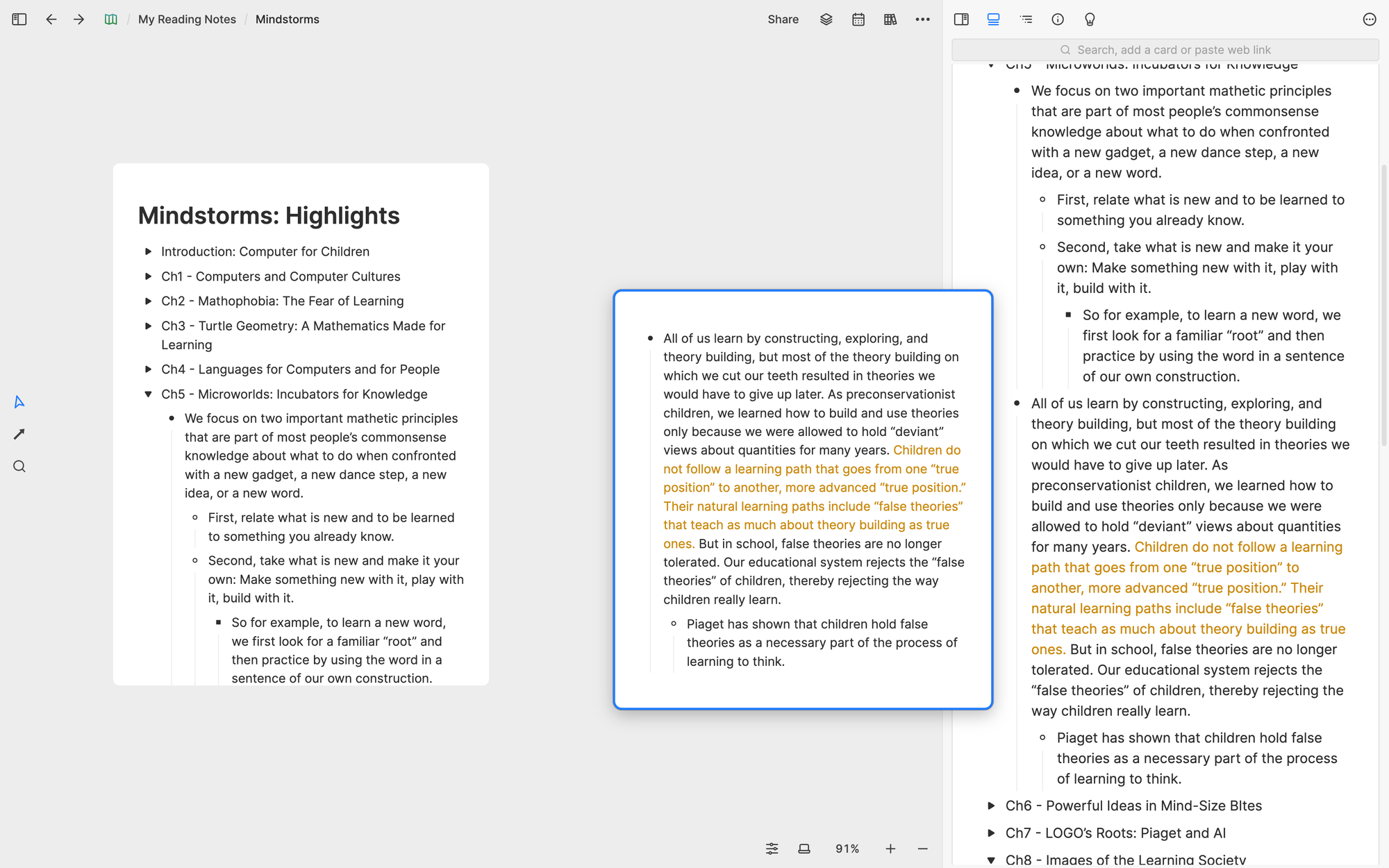 Once I have the card ready, I open it on the right split panel so I can better see its content. I usually start by skimming through all the content to identify key concepts. When I decide that there's a concept I want to extract, I select the related blocks and drag them out onto the whiteboard to create a new concept card.