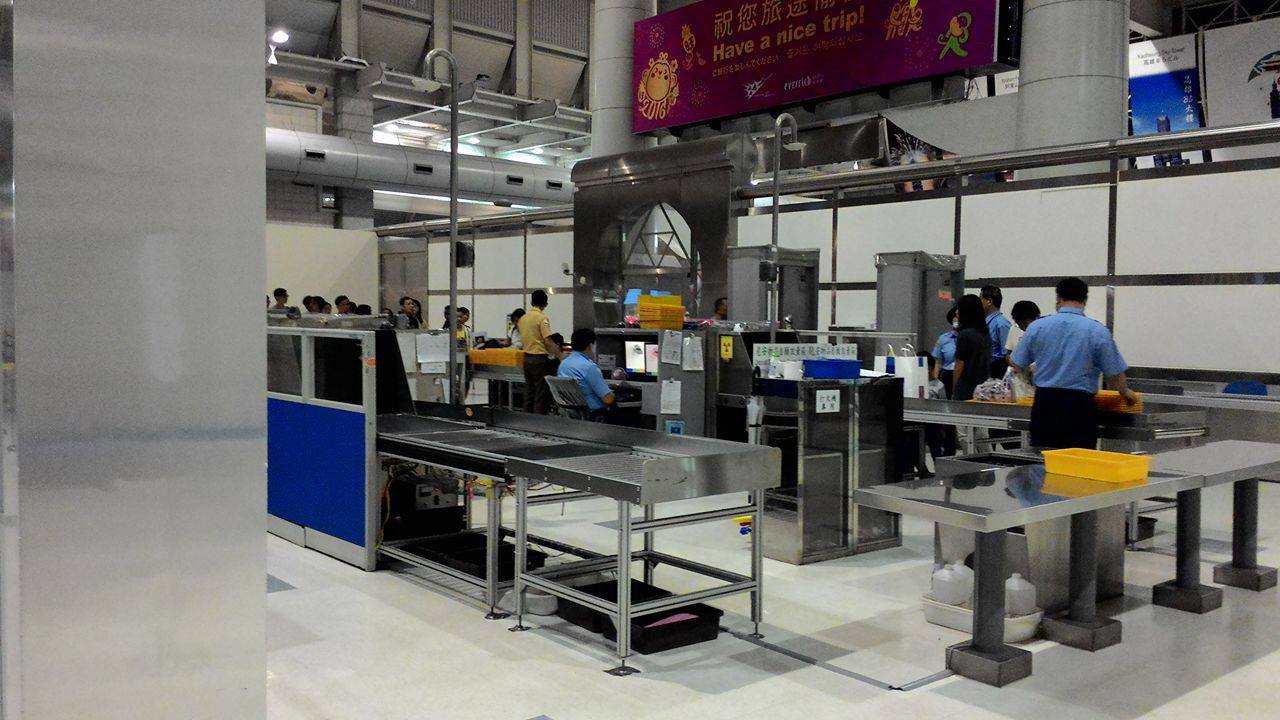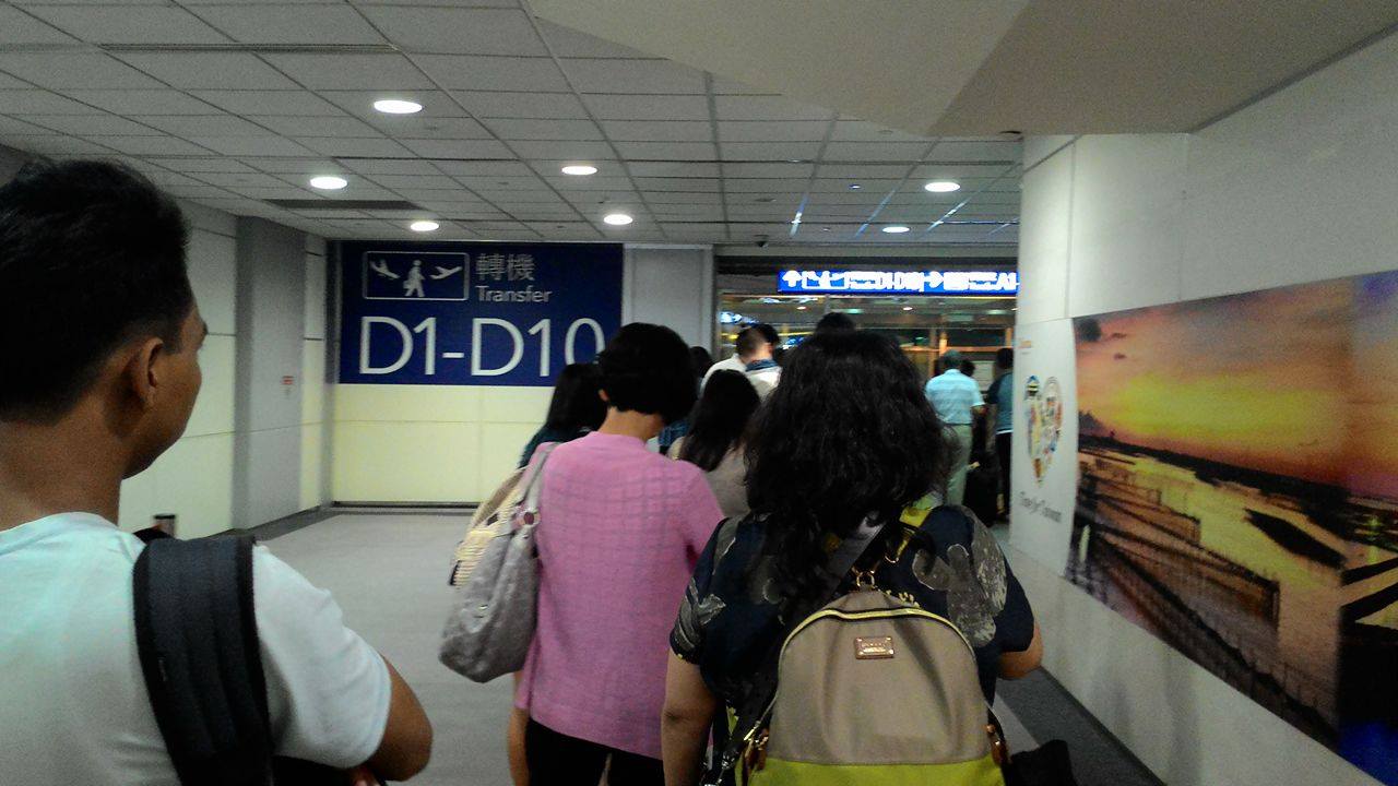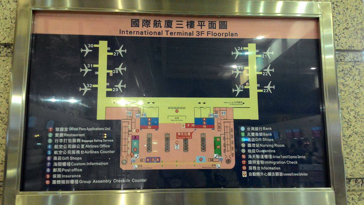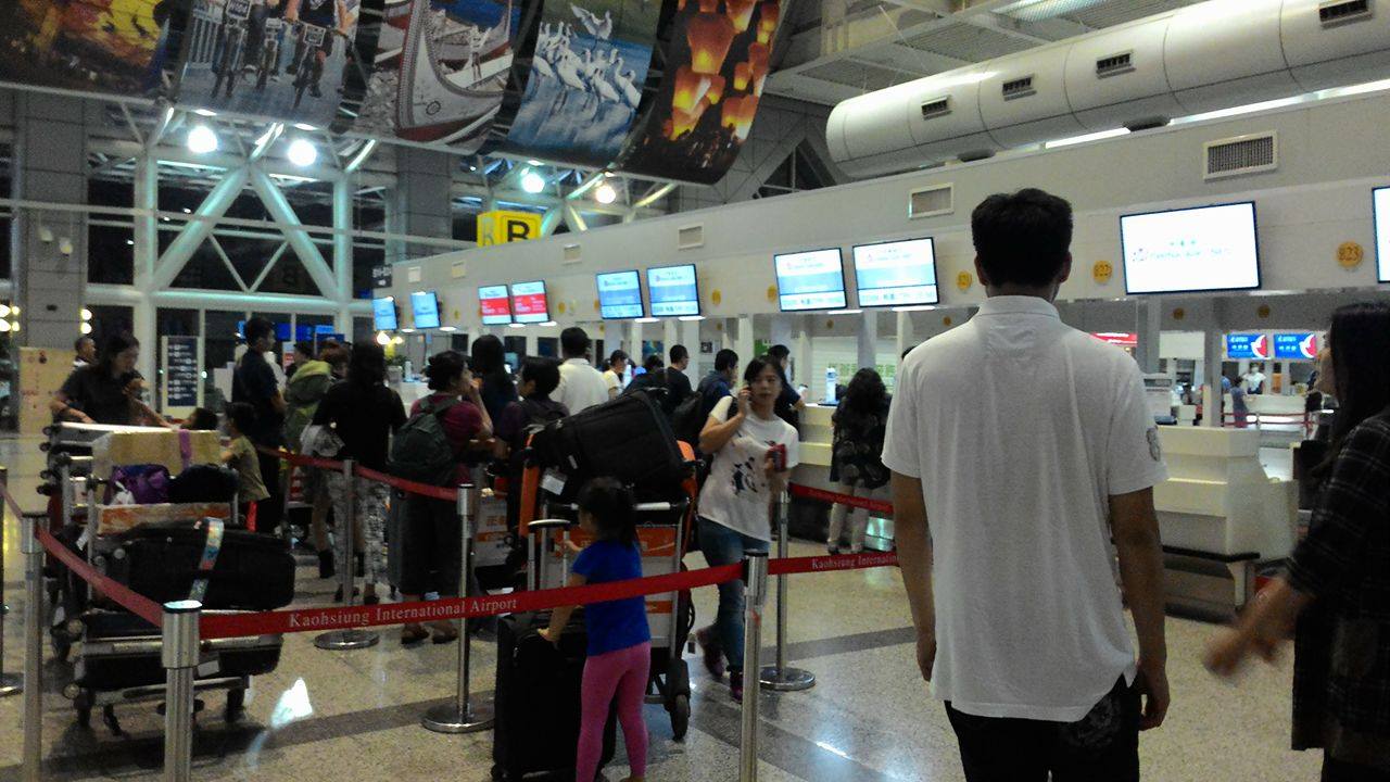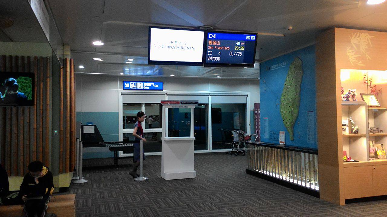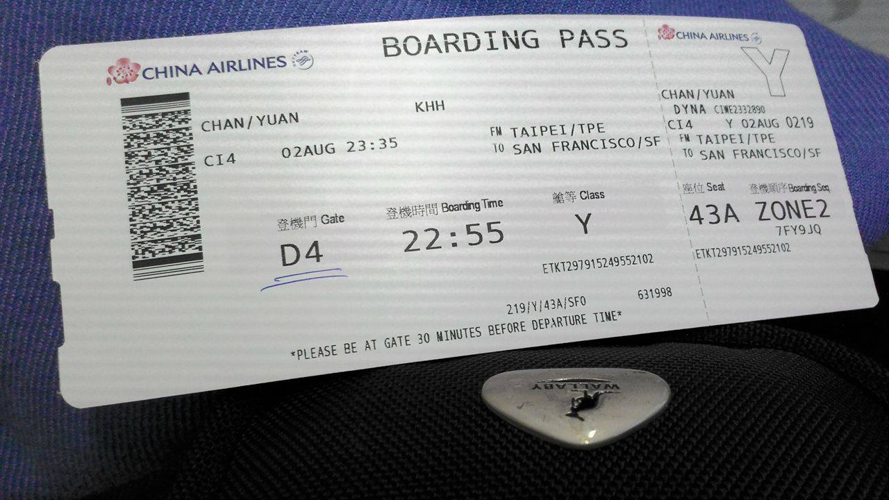 (台灣出境)我的機票方案是兩段式的,要先從高雄小港機場搭飛機到桃園機場,再轉機到舊金山。流程大致上是:在小港機場的華航櫃檯 Check in(要去國際線),拿護照領兩張登機證(飛桃園和飛美國)並托運行李,只留背包和隨身包在身上。接下來就順著出口拿登機證出境,隨身行李要經過一次安檢掃描,掃完還要再拿護照和役男出境申請單給移民署檢查,讓他們問一些問題,通過後才開始找登機口,給空服人員撕登機證上飛機。大約過一個小時到達桃園機場時,會有輛巴士載乘客到轉機所在的航夏,再掃描一次行李後一樣找自己的登機口,待時機差不多時拿著護照和登機證給櫃檯檢查後進到等候室,等飛機快起飛時用登機證登機。